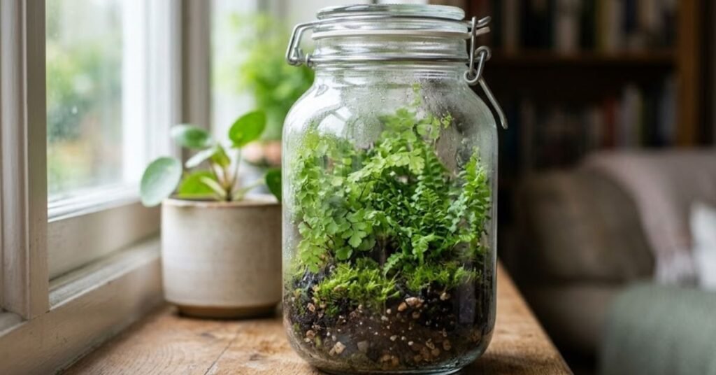 Ferns bring height, texture, and a deeply tropical feel to closed terrariums. The trick is choosing compact varieties — large ferns like Boston Fern quickly outgrow small containers.