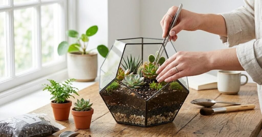Start with a closed terrarium using Fittonia, moss, and Peperomia — three forgiving, beginner-friendly plants that practically take care of themselves once established. Get that right, and you’ll be building more complex terrariums within months.