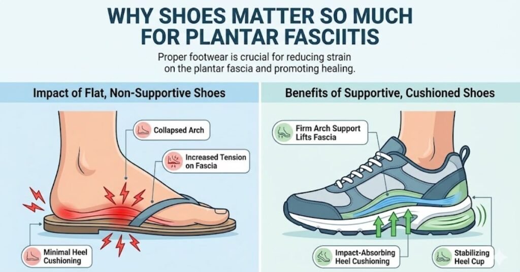 The right shoe spreads that load more evenly, cushions the impact, and stops the heel from slamming down hard. The wrong shoe concentrates all that force on the already-irritated tissue.