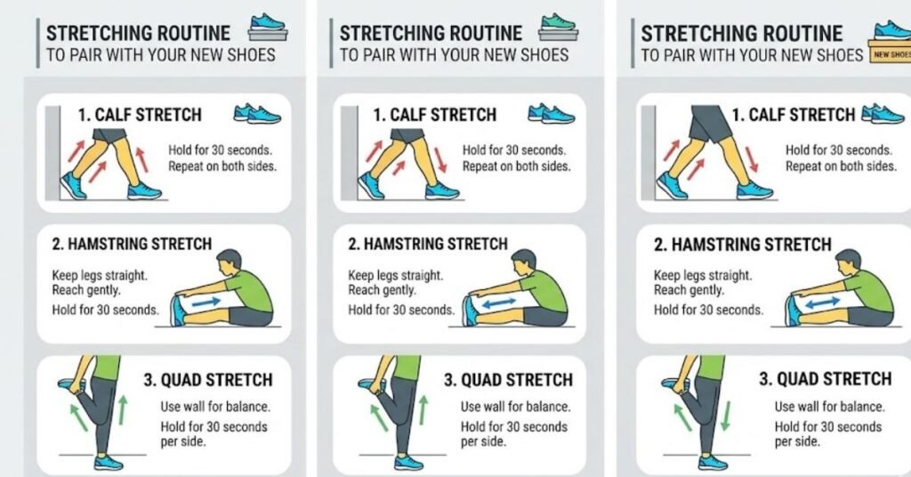 New shoes help most when combined with a daily stretching routine. Some of the best stretches include taking the toes in one hand, gently bending them back toward the shin, and with the other hand massaging the base of the heel and along the plantar fascia, holding for 15–30 seconds.